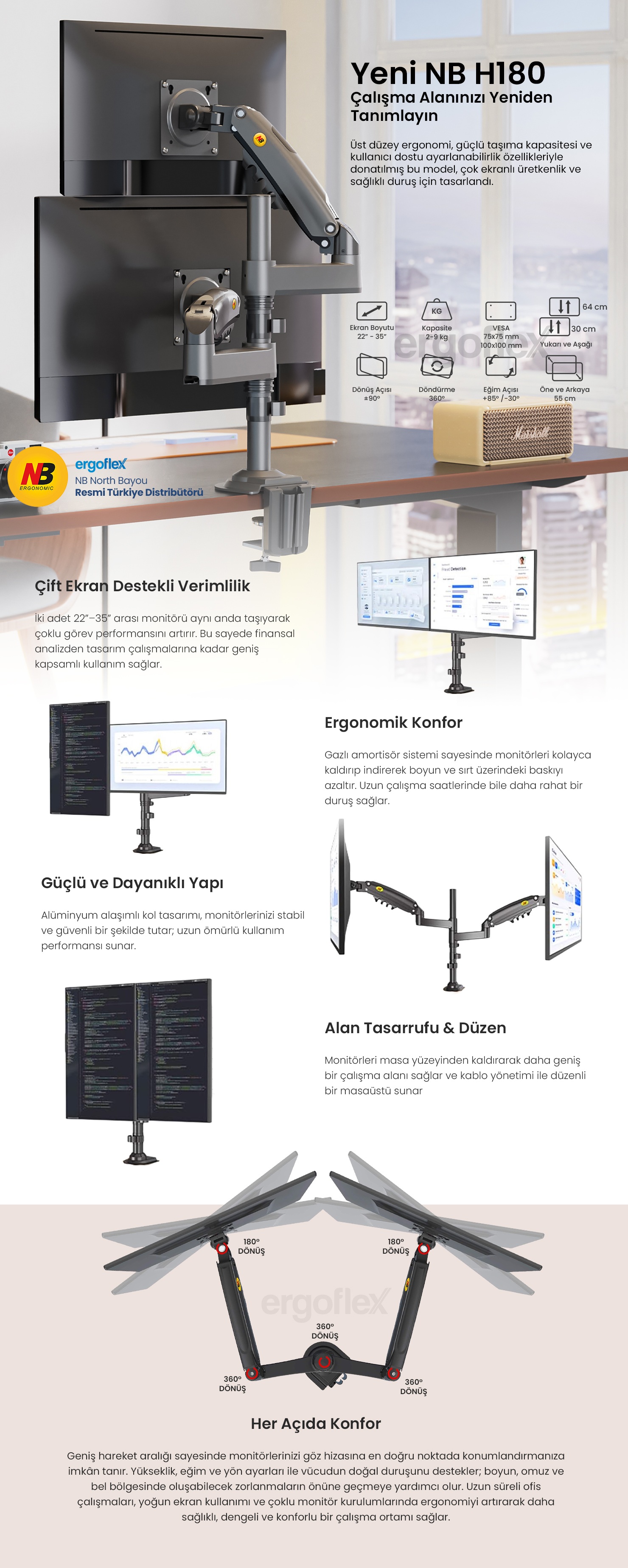monitör standı çift kol monitör standı north bayou nb ergonomic nb h180 H180 monitör standı 22-35 inç monitör standı amortisörlü monitör kolu ayarlanabilir monitör kolu masaüstü monitör standı vesa monitör kolu h180 2026 North bayou h180 2026