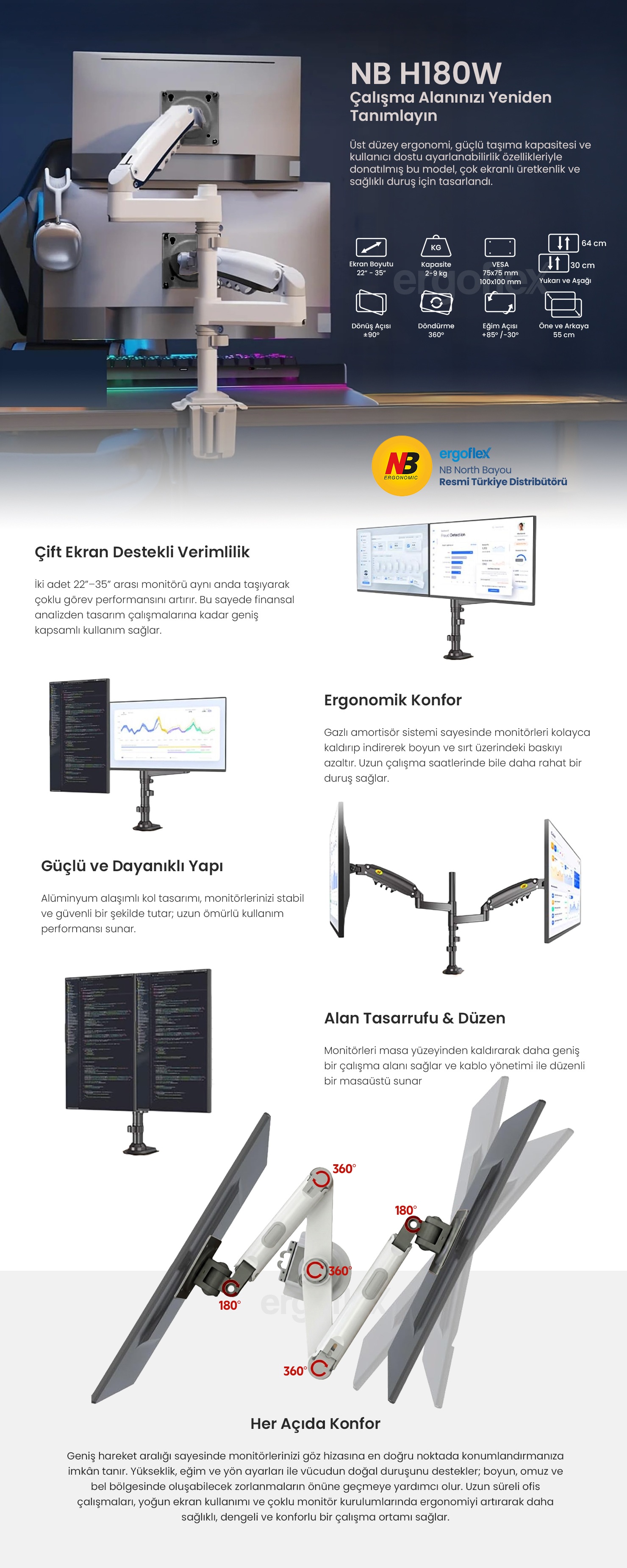 - NB Ergonomic NB H180 22-35inch Çift Kol Amortisörlü 2-9 kg Monitör Standı Beyaz