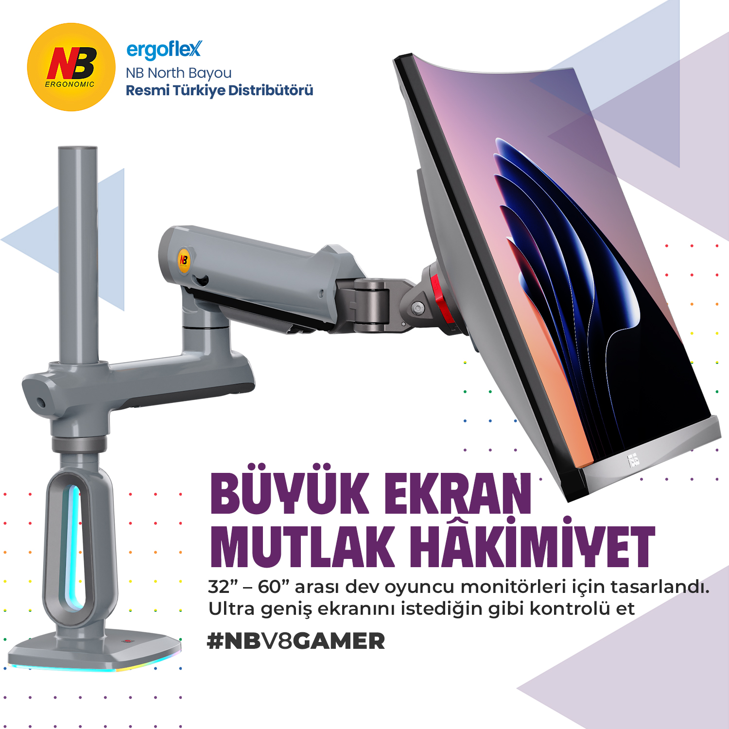 - NB Ergonomic V8-Gaming , 32-60'' 20 KG RGB Aydinlatmali , Oyuncu Monitör Standı