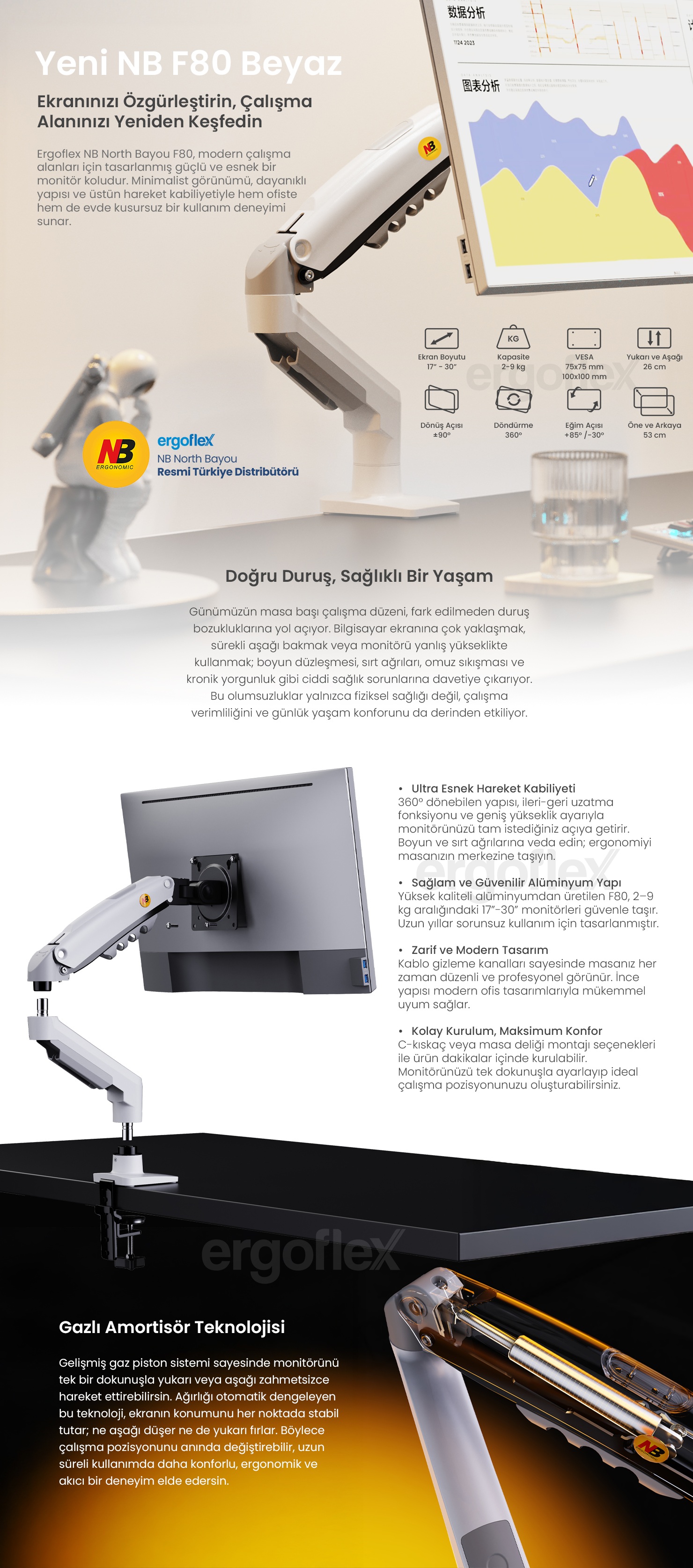- NB Ergonomic NB F80 17-30inch Amortisörlü 2-9 kg Monitör Standı 2026 Versiyon Beyaz